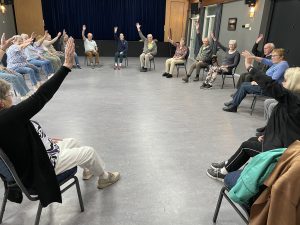 Op de foto zie je dat we deze keer allemaal op de stoel gymmen. We deden deze keer enkele stoeldansen, uiteraard op muziek.