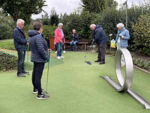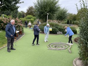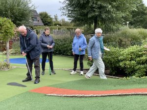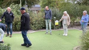 Met fiets of auto er naar toe met 16 personen. Ontvangst met koffie/thee en koek. Een uur mini-golf spelen. Een heerlijke lunch. Nog een uur mini-golf spelen. Tot slot een drankje. Het was een mooi, gezellig en sportief uitje!